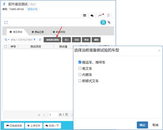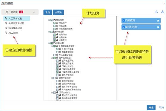 針對上圖:我們選擇了人工叉車試驗這個模板,若全選,那么就是對叉車整車做檢測了。但又的時候甲方并不是整車而是某幾個部件,所以,系統也支持通過特征選項的方式來對計劃任務進行篩選。 篩選完成后確定,就能生成新的測試項目。